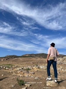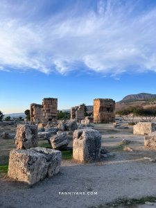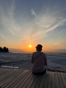 Kami menenumkan area sepi di Cotton castle karena airnya kering tapi bagus buat photo dan duduk bersantai 😀 Dari pintu masuk jalan terus sampai ujung. Kami duduk-duduk di sini lama, let the time pass by sambil melihat matahari terbenam cahayanya memantul di atas cotton castle. Cuaca di Pamukkale berbeda dari Istanbul dan Cappadocia. Di sini lebih panas.