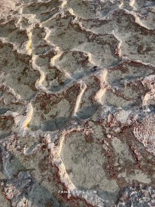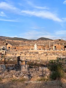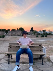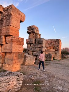 Kami menenumkan area sepi di Cotton castle karena airnya kering tapi bagus buat photo dan duduk bersantai 😀 Dari pintu masuk jalan terus sampai ujung. Kami duduk-duduk di sini lama, let the time pass by sambil melihat matahari terbenam cahayanya memantul di atas cotton castle. Cuaca di Pamukkale berbeda dari Istanbul dan Cappadocia. Di sini lebih panas.